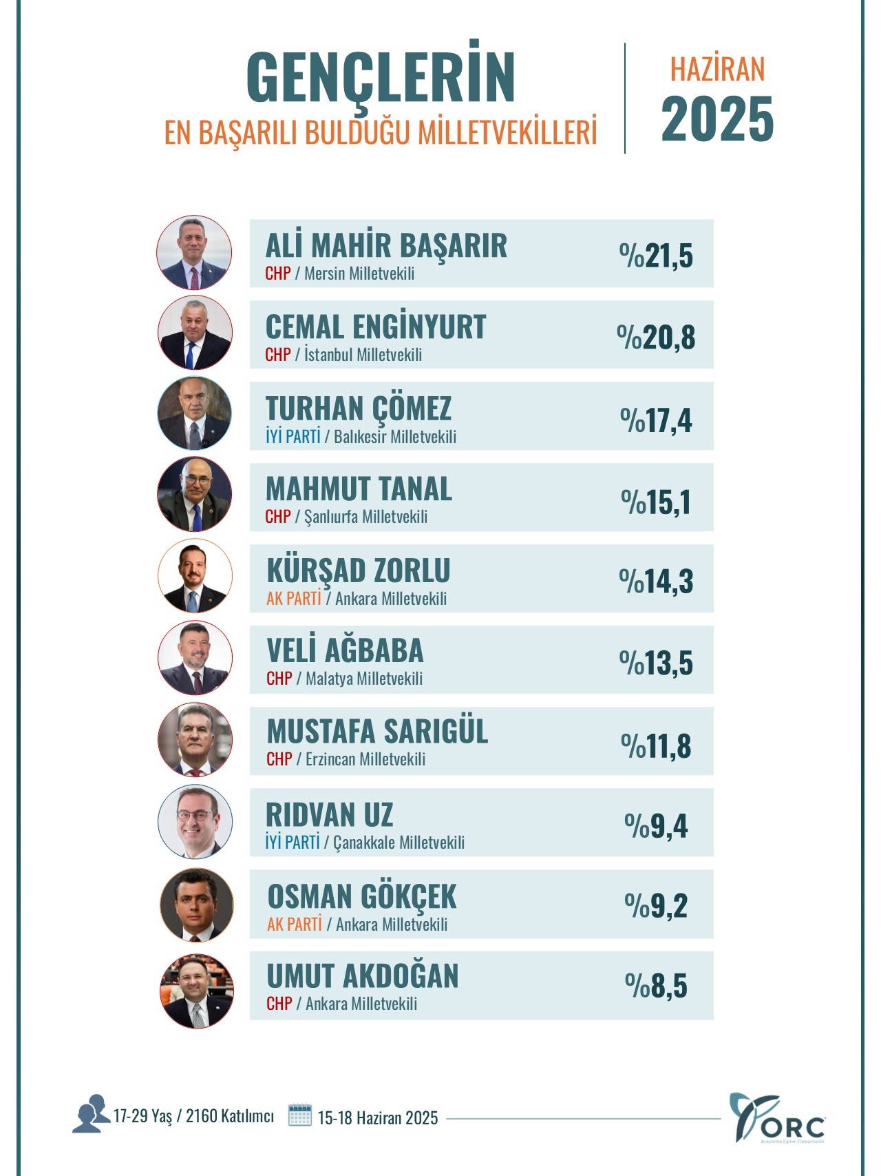 Gençlerin en beğendiği milletvekili yüzde 21,5 ile CHP Mersin Milletvekili Ali Mahir Başarır oldu. Başarır'ı yüzde 20,8 ile CHP İstanbul Milletvekili Cemal Enginyurt ve yüzde 17,4 ile İYİ Parti Balıkesir Milletvekili Turhan Çömez takip etti.