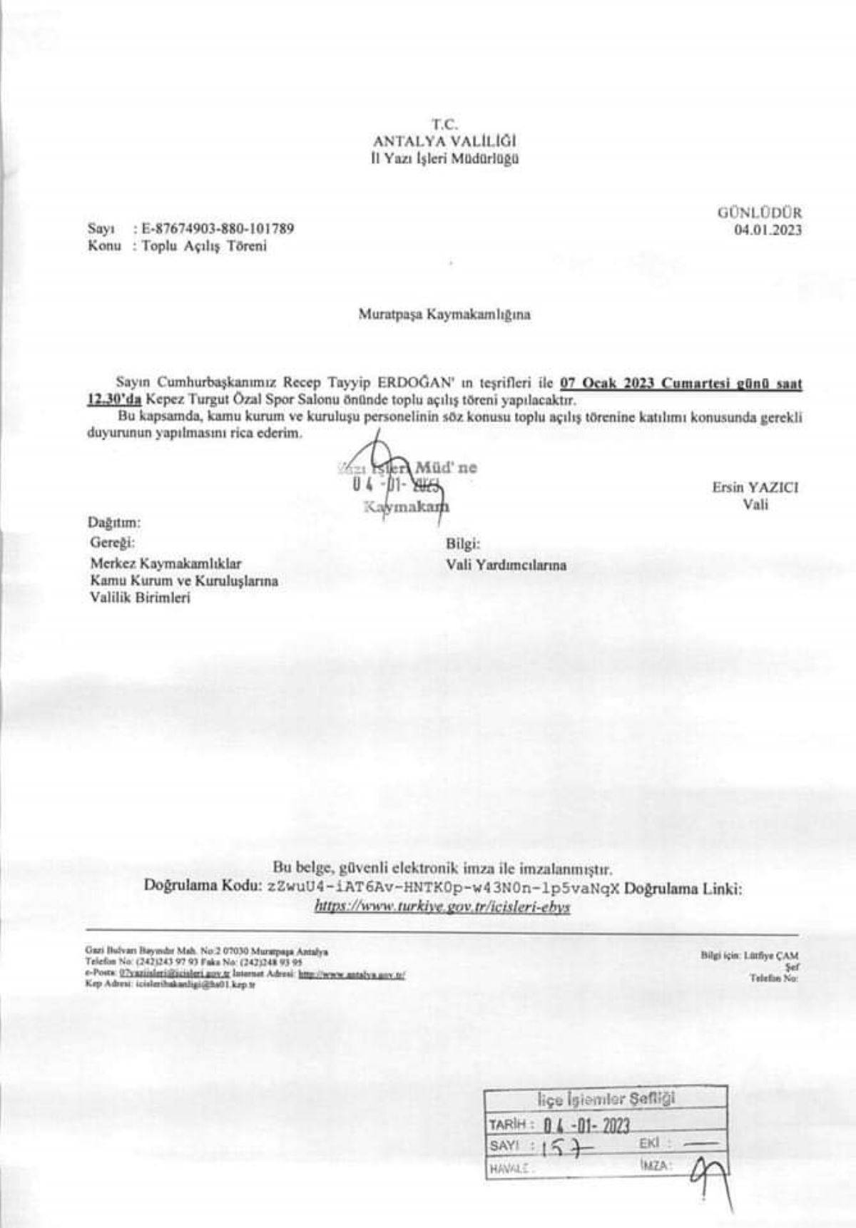 Halktv.com.tr'de yapılan habere göre, Erdoğan'ın katılacağı törene katılım için Valilik harekete geçti. Muratpaşa Kaymakamlığı'na yazı gönderen Antalya Valiliği kurum ve kuruluş personellerine duyuru yapılmasını istedi.