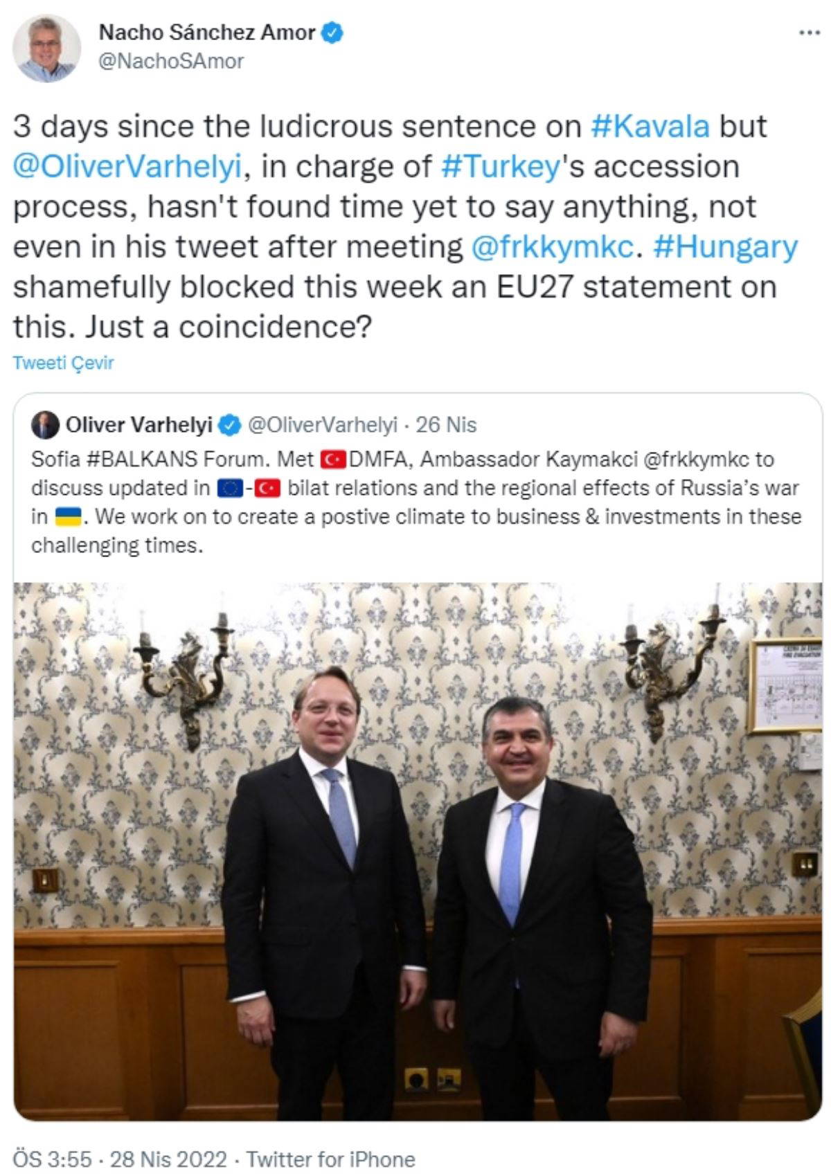 "Kavala'ya verilen gülünç hükmün üzerinden üç gün geçti ancak Türkiye'nin üyelik sürecinden sorumlu Oliver Varhelyi, Faruk Kaymakçı ile görüştükten sonra attığı tweet'te bile bir şey söylemeye vakit bulamadı. Bu hafta Macaristan bu konuyla ilgili bir EU27 açıklamasını utanç verici bir şekilde engelledi. Bu sadece tesadüf mü?"