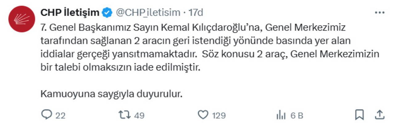 "7. Genel Başkanımız Sayın Kemal Kılıçdaroğlu’na, Genel Merkezimiz tarafından sağlanan 2 aracın geri istendiği yönünde basında yer alan iddialar gerçeği yansıtmamaktadır. Söz konusu 2 araç, Genel Merkezimizin bir talebi olmaksızın iade edilmiştir.