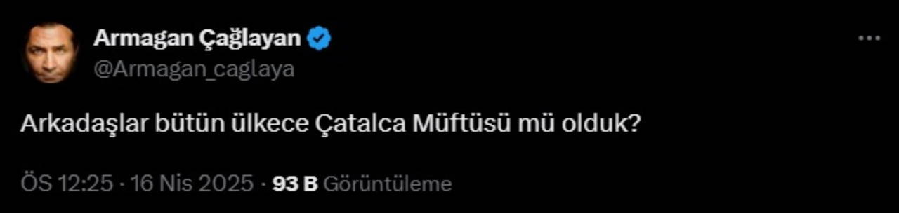 Çağlayan, X’ten yaptığı paylaşımda "Arkadaşlar bütün ülkece Çatalca Müftüsü mü olduk?" dedi.