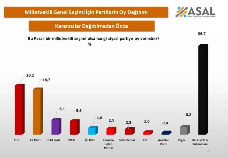 Ankette ilk sırayı CHP yüzde 20.2 puan alırken ikinci sırada yüzde 18.7 ile AKP olduğu görüldü. Anket verilerine göre; oy oranına olarak bakıldığında yüzde 36.7 puan ile "Kararsız/Oy kullanmam" diyenlerin en yüksek yüzdeye ulaştığı görüldü.