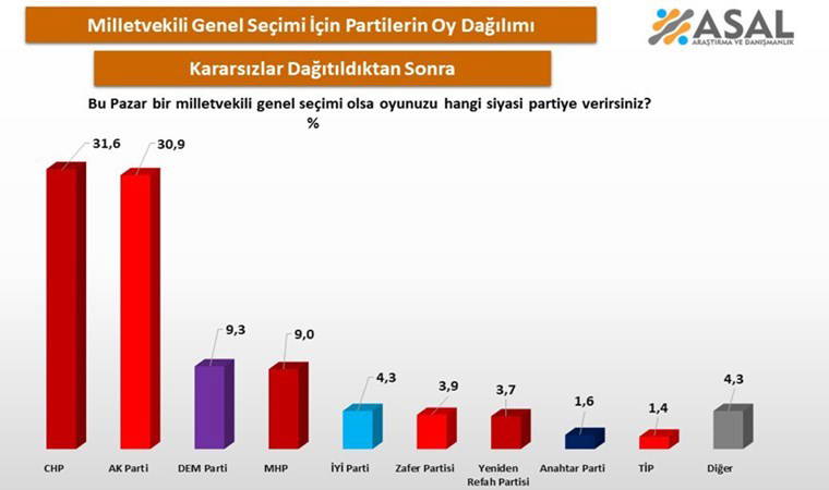 Sonuçlara göre, yapılan ankette Kararsızlar/Oy Kullanmayacağım/Fikrim Yok/Cevap Yok/yanıtları orantısal olarak dağıtıldıktan sonra CHP'ye oy vereceğini belirtenlerin oranı yüzde 31,6 olurken; tercihi AKP'den yana olanların oranı yüzde 30,9'da kaldı.