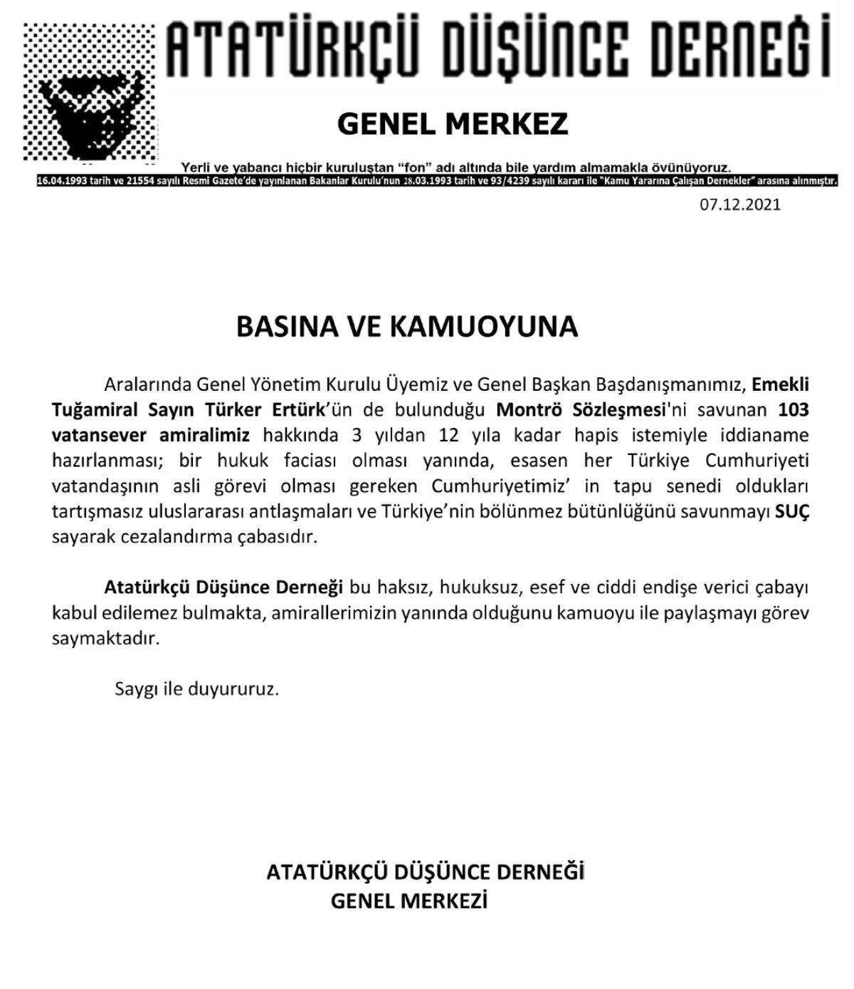 Haklarında iddianame hazırlanan amiraller arasında bulunan Türker Ertürk'ün, derneklerinin Genel Yönetim Kurulu Üyesi ve Genel Başkan Başdanışmanı olduğunu hatırlatılan açıklamada, iddianamenin bir hukuk faciası olduğu belirtilerek, "Cumhuriyetimiz'in tapu senedi oldukları tartışmasız uluslararası antlaşmaları ve Türkiye'nin bölünmez bütünlüğünü savunmayı suç sayarak cezalandırma çabasıdır" denildi.