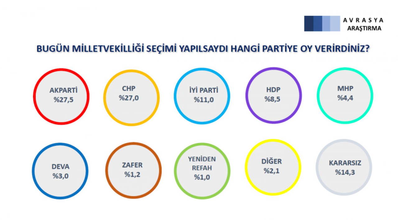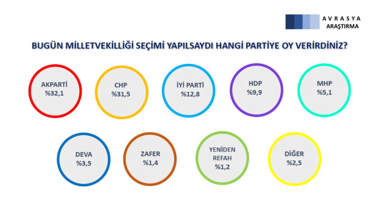 Avrasya Araştırma, 28 Ocak - 2 Şubat tarihleri arasında; 26 ilde 2 bin 460 kişiyle yaptığı anketin sonuçları açıklandı. Buna göre AKP ve CHP arasındaki fark yüzde 0.6.