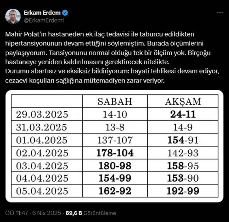 "Mahir Polat’ın hastaneden ek ilaç tedavisi ile taburcu edildikten hipertansiyonunun devam ettiğini söylemiştim. Burada ölçümlerini paylaşıyorum. Tansiyonunun normal olduğu tek bir ölçüm yok. Birçoğu hastaneye yeniden kaldırılmasını gerektirecek nitelikte. Durumu abartısız ve eksiksiz bildiriyorum: Hayati tehlikesi devam ediyor, cezaevi koşulları sağlığına mütemadiyen zarar veriyor."