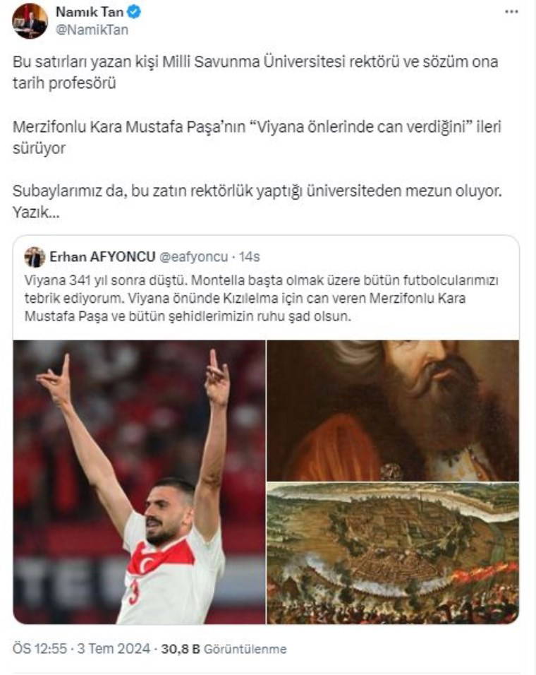 Ancak bunlar arasında biri, kısa sürede çok konuşulanlar arasına girdi. Galibiyeti, 1683 yılında Osmanlı Devleti'nin eli boş döndüğü 2. Viyana Kuşatması'na gönderme yaparak "Viyana 341 yıl sonra düştü" diye kutlayan o isim Milli Savunma Üniversitesi Rektörü Prof. Dr. Erhan Afyoncu oldu.