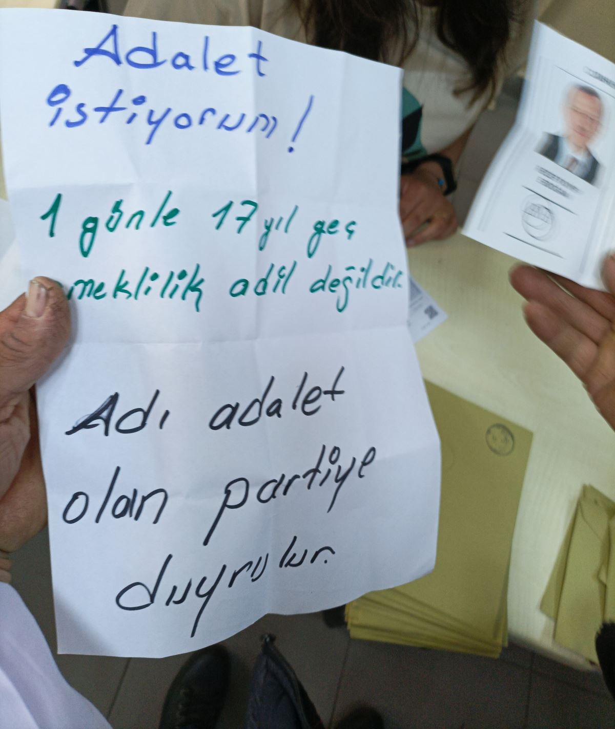 Notta, "Adalet istiyorum! 1 günle 17 yıl geç emeklilik adil değildir. Adı adalet olan partiye duyurulur" ifadeleri yer aldı.