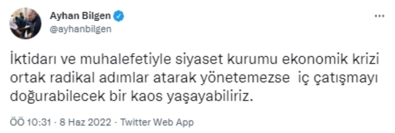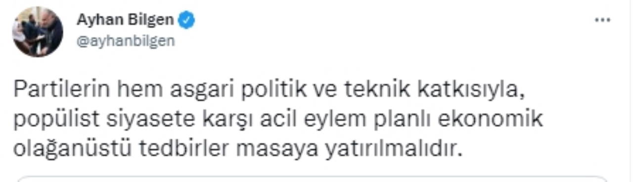 Paylaşımlarında "İktidarı ve muhalefetiyle siyaset kurumu ekonomik krizi ortak radikal adımlar atarak yönetemezse iç çatışmayı doğurabilecek bir kaos yaşayabiliriz" uyarısında bulunan Bilgen, "Partilerin hem asgari politik ve teknik katkısıyla, popülist siyasete karşı acil eylem planlı ekonomik olağanüstü tedbirler masaya yatırılmalıdır" ifadelerini kullandı.