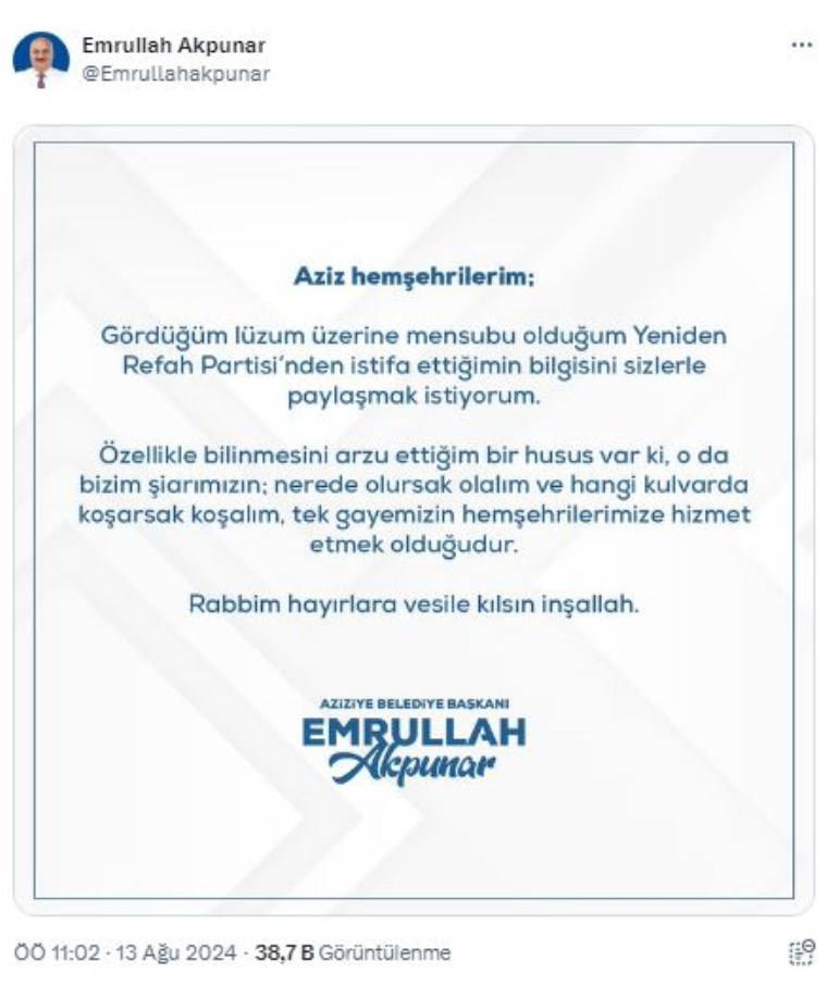 "Gördüğüm lüzum üzerine mensubu olduğum Yeniden Refah Partisinden istifa ettiğim bilgisini sizlerle paylaşmak istiyorum. Özellikle bilinmesini arzu ettiğim bir husus var ki o da bizim şiarımızın nerede olursak olalım ve hangi kulvarda koşarsak koşalım tek gayemizin hemşerilerimize hizmet etmek olduğudur. Rabbim hayırlara vesile kılsın inşallah."