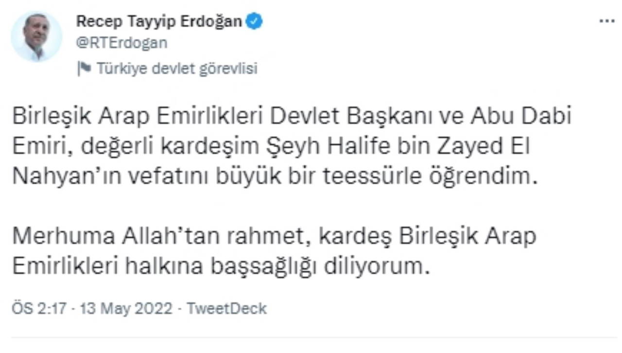 Erdoğan, Al Nahyan'ın ölümü üzerine resmi sosyal medya hesabı üzerinden de bir taziye mesajı yayımladı. AKP'li Cumhurbaşkanı mesajında "Birleşik Arap Emirlikleri Devlet Başkanı ve Abu Dabi Emiri, değerli kardeşim Şeyh Halife bin Zayed El Nahyan’ın vefatını büyük bir teessürle öğrendim. Merhuma Allah’tan rahmet, kardeş Birleşik Arap Emirlikleri halkına başsağlığı diliyorum" ifadelerini kullandı.