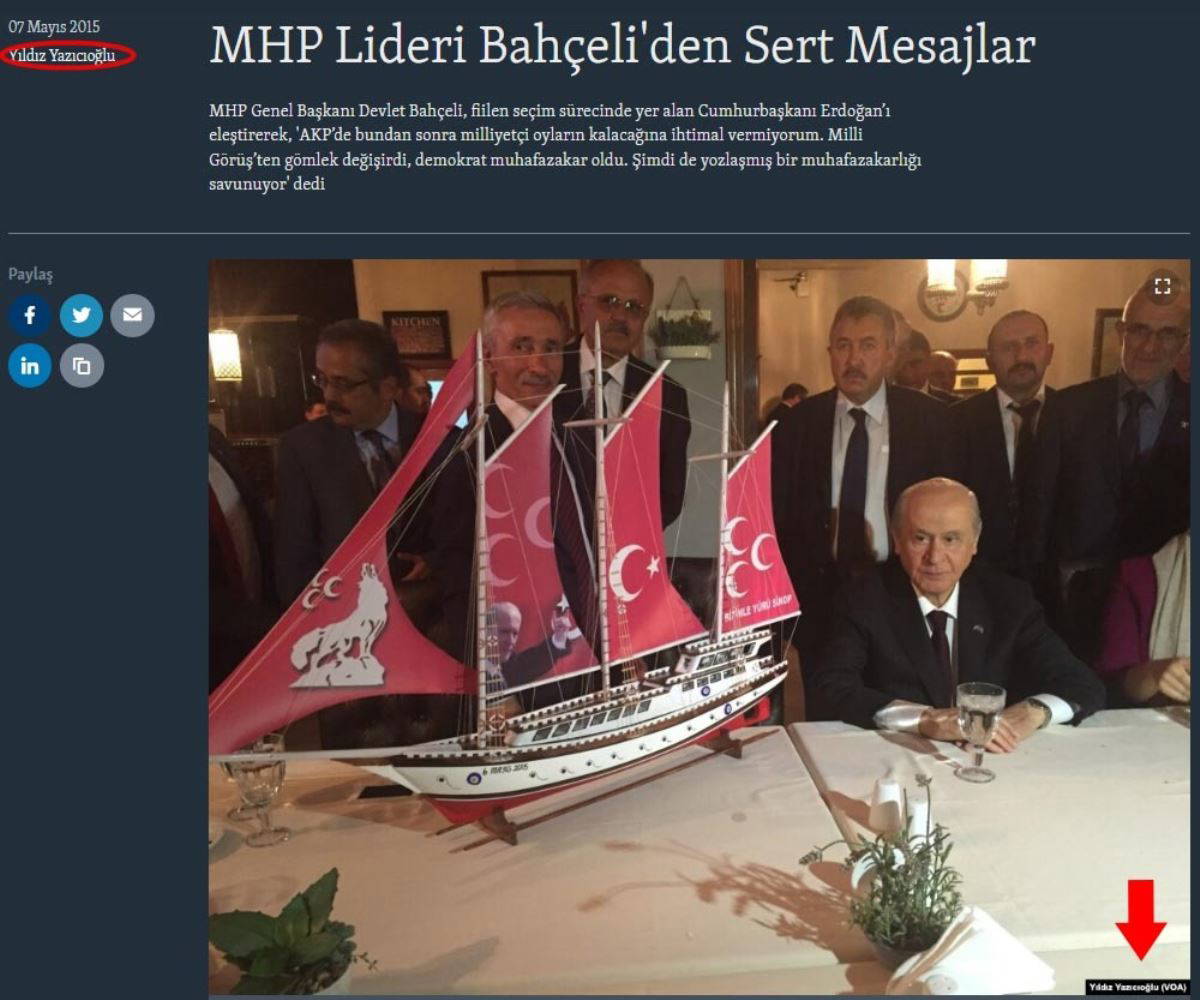 VOA Türkçe'de 7 Mayıs 2015 tarihinde "MHP Lideri Bahçeli'den Sert Mesajlar" başlığıyla yayımlanan haberde Bahçeli, AKP'li Cumhurbaşkanı Recep Tayyip Erdoğan'ı "AKP’de bundan sonra milliyetçi oyların kalacağına ihtimal vermiyorum. Milli Görüş’ten gömlek değişirdi, demokrat muhafazakar oldu. Şimdi de yozlaşmış bir muhafazakarlığı savunuyor" diyerek eleştiriyor.