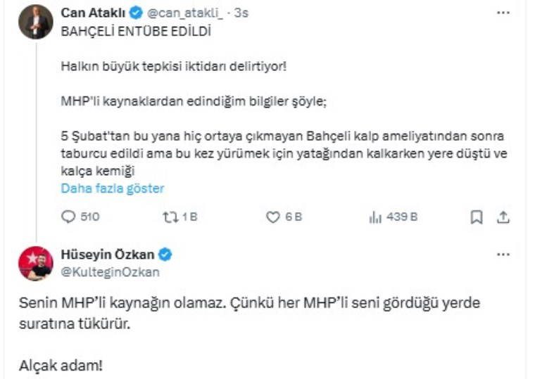 "MHP'li kaynaklardan edindiğim bilgiler şöyle; 5 Şubat'tan bu yana hiç ortaya çıkmayan Bahçeli kalp ameliyatından sonra taburcu edildi ama bu kez yürümek için yatağından kalkarken yere düştü ve kalça kemiği kırıldı. Bahçeli yoğun bakıma alındı ama ameliyatın etkileri ve diğer sağlık sorunları nedeniyle bitkisel hayata girdi ve entübe edildi."