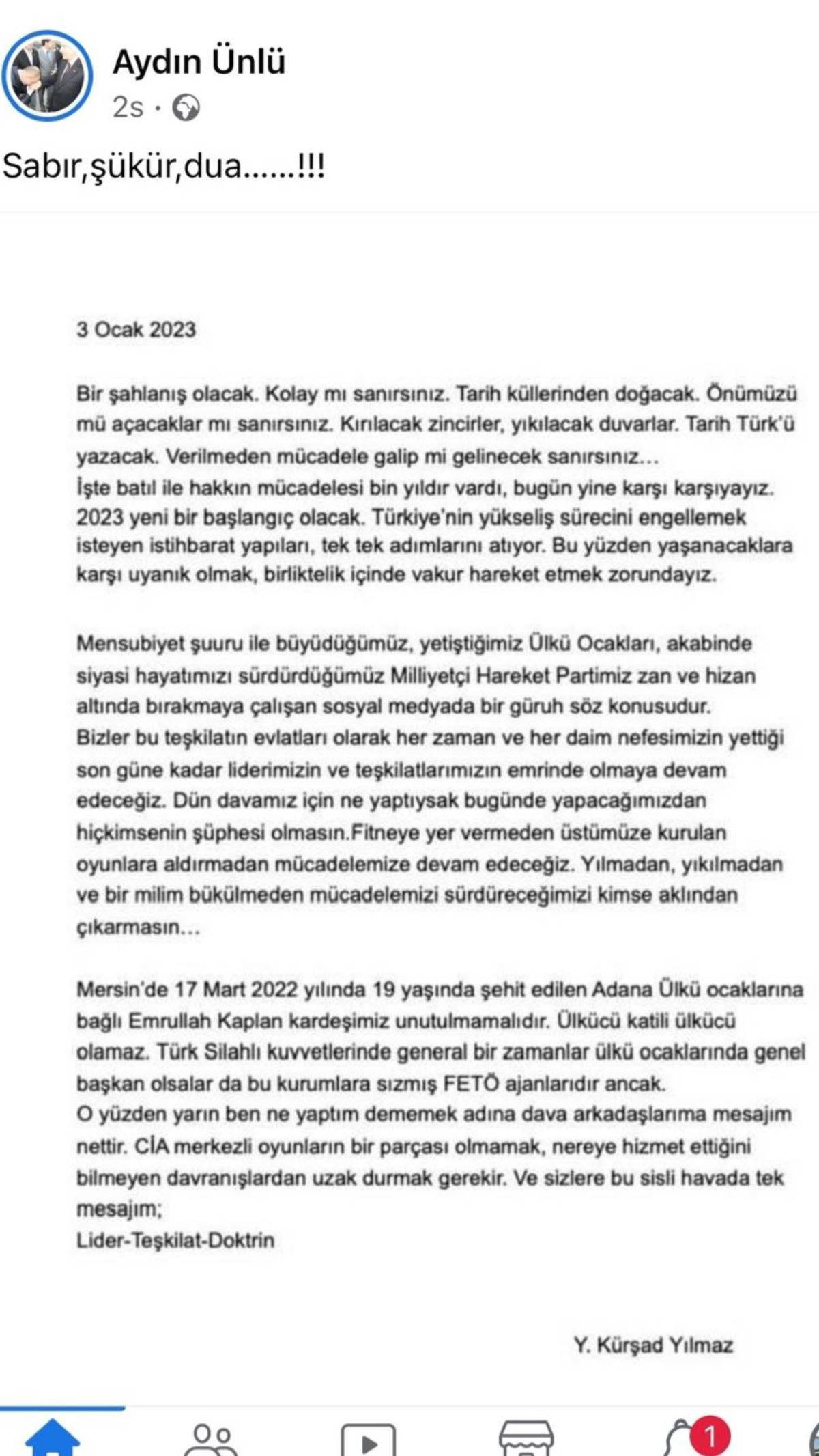 Mensubiyet şuuru ile büyüdüğümüz, yetiştiğimiz Ülkü Ocakları, akabinde siyasi hayatımızı sürdürdüğümüz Milliyetçi Hareket Partimiz zan ve hizan altında bırakmaya çalışan sosyal medyada bir güruh söz konusudur. Bizler bu teşkilatın evlatları olarak her zaman ve her daim nefesimizin yettiği son güne kadar liderimizin ve teşkilatlarımızın emrinde olmaya devam edeceğiz. Dün davamız İçin ne yaptıysak bugünde yapacağımızdan hiçkimsenin şüphesi olmasın. Fitneye yer vermeden üstümüze kurulan oyunlara aldırmadan mücadelemize devam edeceğiz. Yılmadan, yıkılmadan ve bir milim bükülmeden mücadelemizi sürdüreceğimizi kimse aklından çıkarmasın...