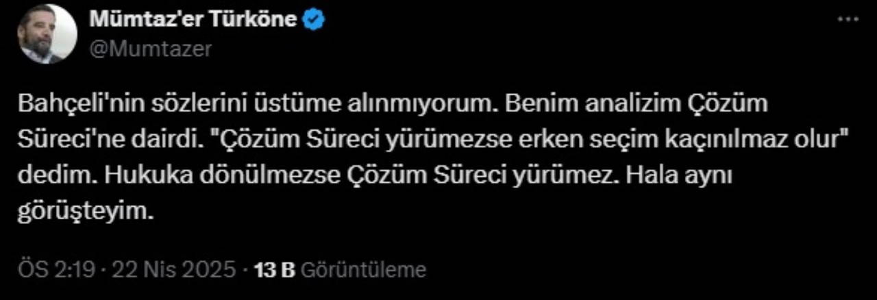 Türköne, "Çözüm Süreci yürümezse erken seçim kaçınılmaz olur dedim. Hukuka dönülmezse Çözüm Süreci yürümez. Hala aynı görüşteyim" ifadelerini kullandı.
