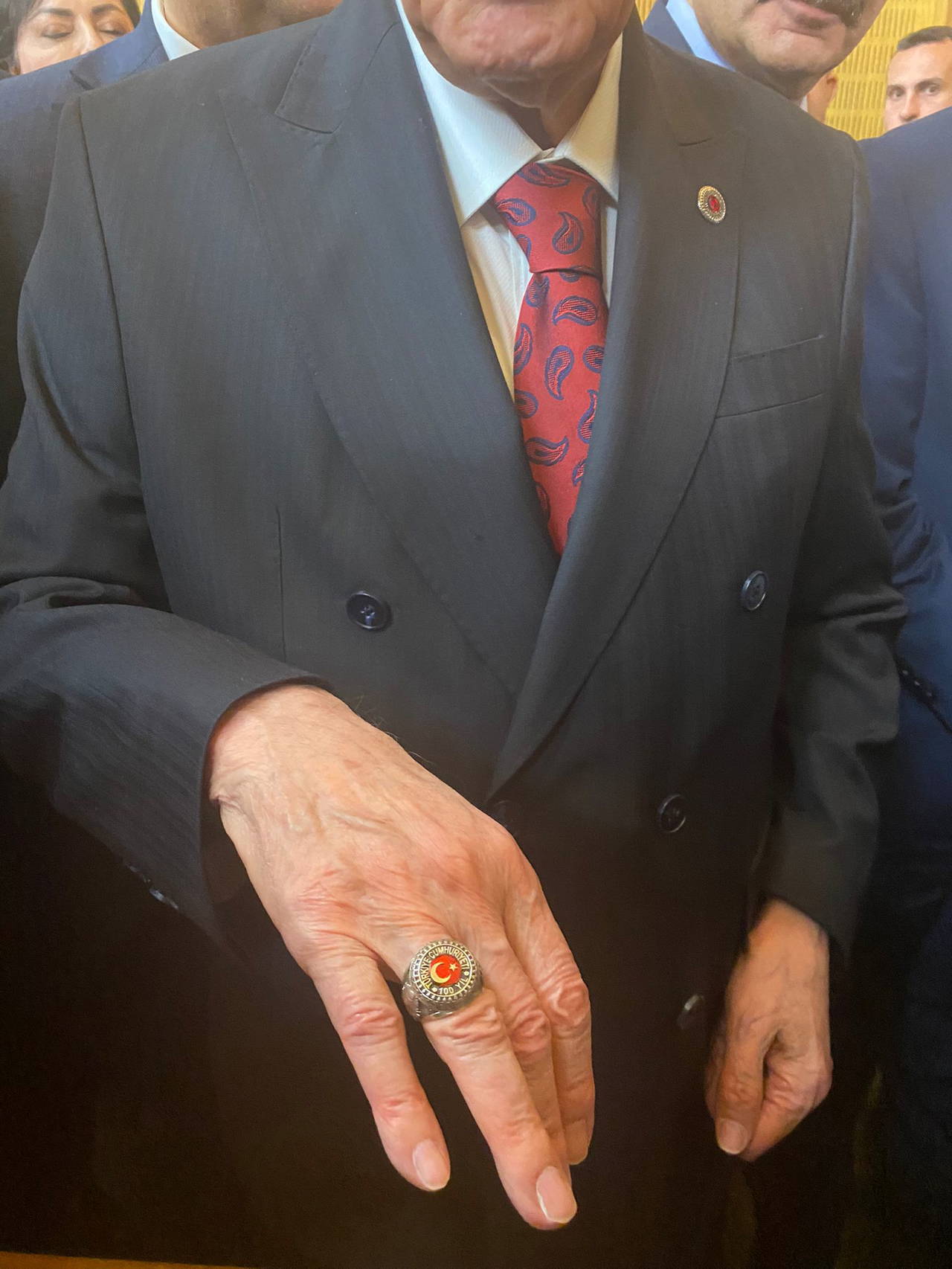 Ayrıca Bahçeli'nin parmağında, üzerinde 'Türkiye Cumhuriyeti 100 yıl' yazan yüzük olduğu görüldü.