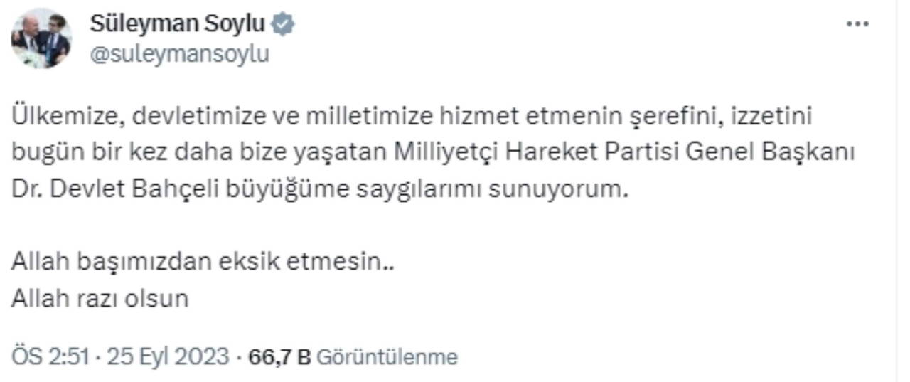 Soylu, MHP liderinin açıklamasından kısa bir süre sonra sosyal medya hesabı üzerinden yaptığı paylaşımda şu ifadeleri kullandı: