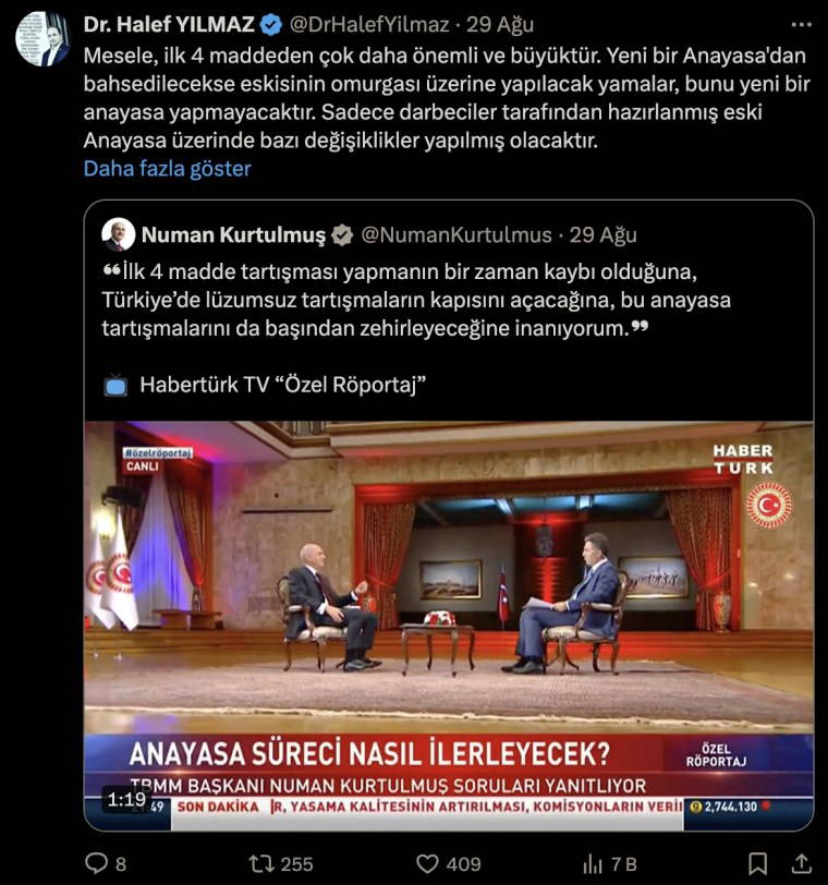 HÜDA PAR Genel Başkan Vekili Halef Yılmaz, TBMM Başkanı Numan Kurtulmuş'un, yeni anayasa tartışmalarına ilişkin, "İlk 4 madde tartışması yapmanın bir zaman kaybı olduğuna inanıyorum" şeklindeki değerlendirmesine yanıt verdi.