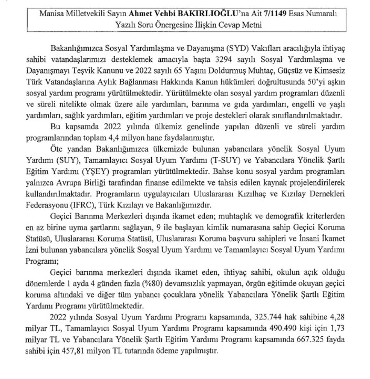 Cumhuriyet Halk Partisi (CHP) Manisa Milletvekili Ahmet Vehbi Bakırlıoğlu’nun soru önergesini yanıtlayan Aile ve Sosyal Hizmetler Bakanı Mahinur Özdemir Göktaş, Türkiye’deki sosyal yardımların miktarını açıkladı.