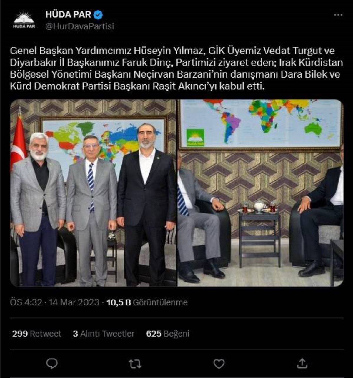 “Genel Başkan Yardımcımız Hüseyin Yılmaz, GİK Üyemiz Vedat Turgut ve Diyarbakır İl Başkanımız Faruk Dinç, Partimizi ziyaret eden; Irak Kürdistan Bölgesel Yönetimi Başkanı Neçirvan Barzani’nin danışmanı Dara Bilek ve Kürd Demokrat Partisi Başkanı Raşit Akıncı’yı kabul etti. Ziyarette; HÜDA PAR’ın siyasi duruşu ve güncel siyasi gelişmeler ele alındı. Partimizin 14 Mayıs 2023 tarihinde yapılacak olan genel seçimlere katılması nedeniyle tebrik ve başarı dileklerini ilettiler. Nazik ziyaretlerinden dolayı partimiz adına teşekkür ederiz.”