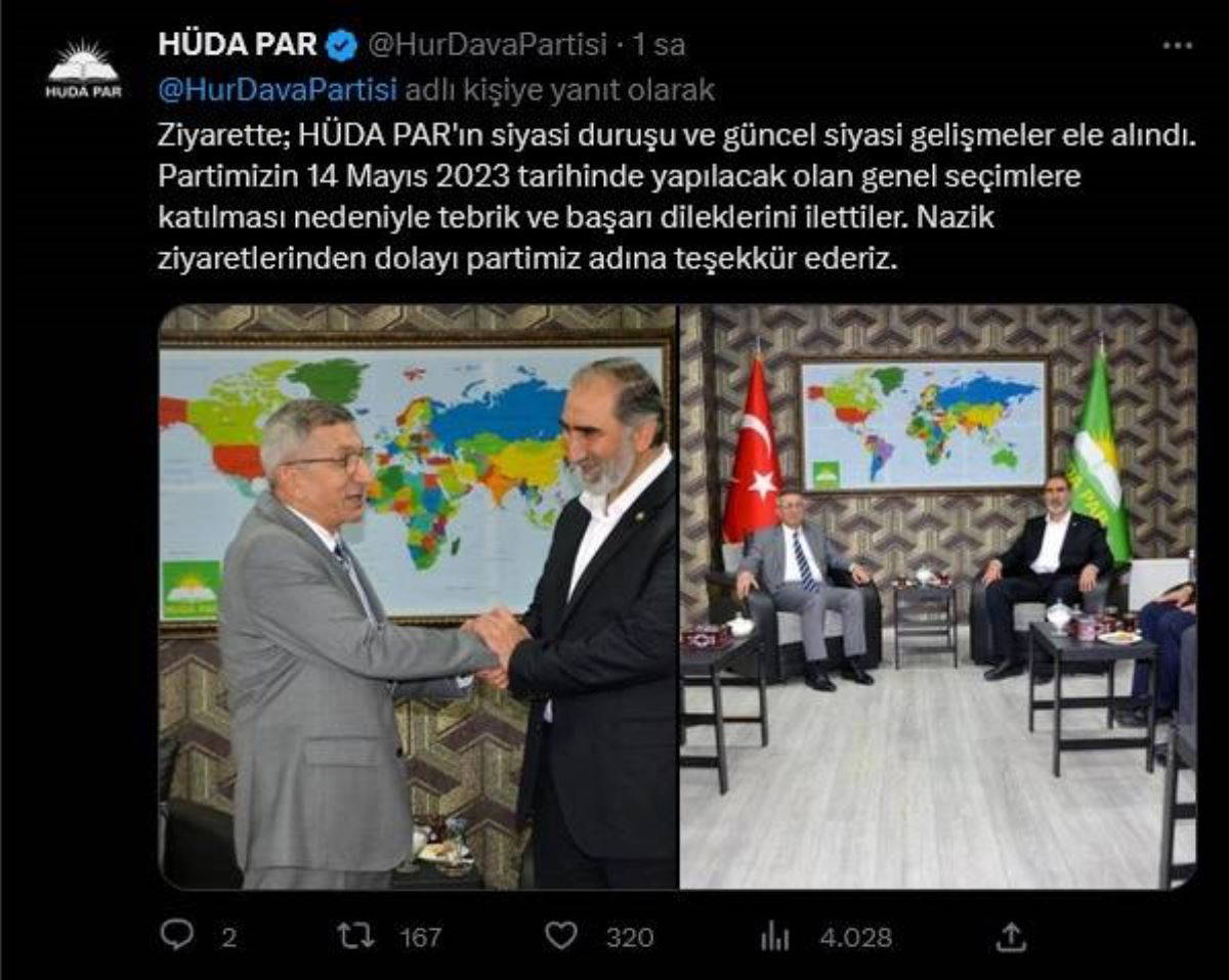 Hür Dava Partisi (HÜDA PAR) 14 Mayıs’ta yapılması planlanan genel seçimlerde Cumhur İttifakı’nın cumhurbaşkanı adayı Recep Tayyip Erdoğan’ı destekleyeceğini açıklamıştı.