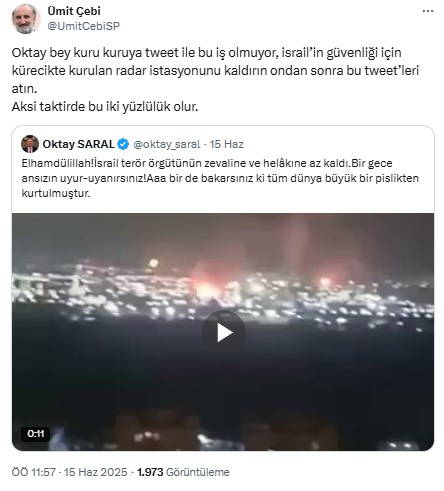 Bunun üzerine Saral'a Saadet Partisi Genel İdare Kurulu Üyesi Ümit Çebi'den Saral'a dikkat çeken bir tepki geldi. Saral'a "Oktay bey kuru kuruya tweet ile bu iş olmuyor" diye seslenen Çebi, "İsrail’in güvenliği için Kürecik'te kurulan radar istasyonunu kaldırın, ondan sonra bu tweet’leri atın. Aksi takdirde bu iki yüzlülük olur" dedi.