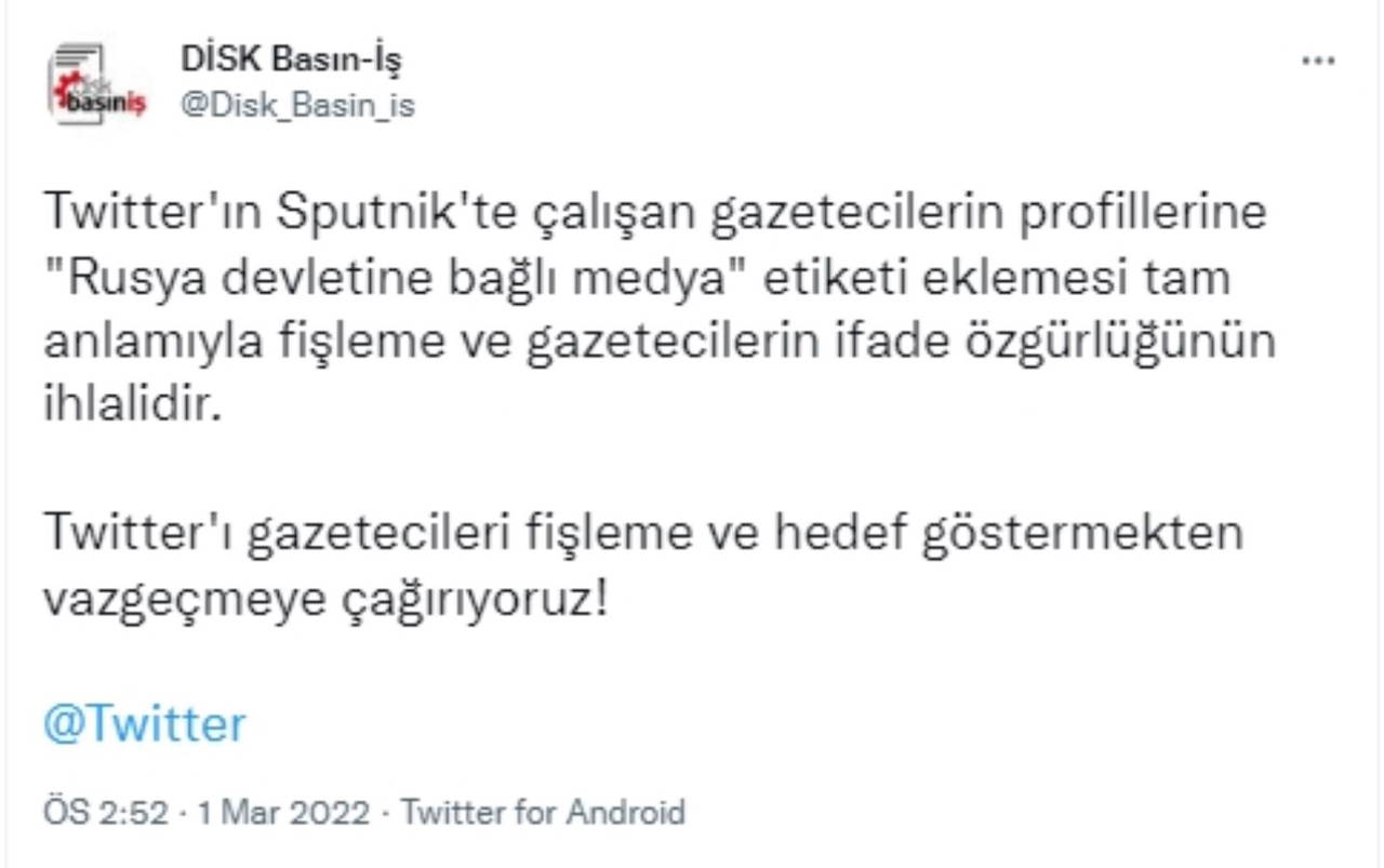 DİSK Basın-İş'ten yapılan açıklamada "Twitter'ın Sputnik'te çalışan gazetecilerin profillerine "Rusya devletine bağlı medya" etiketi eklemesi tam anlamıyla fişleme ve gazetecilerin ifade özgürlüğünün ihlalidir" denildi. Açıklamada, "Twitter'ı gazetecileri fişleme ve hedef göstermekten vazgeçmeye çağırıyoruz!" çağrısı yapıldı.