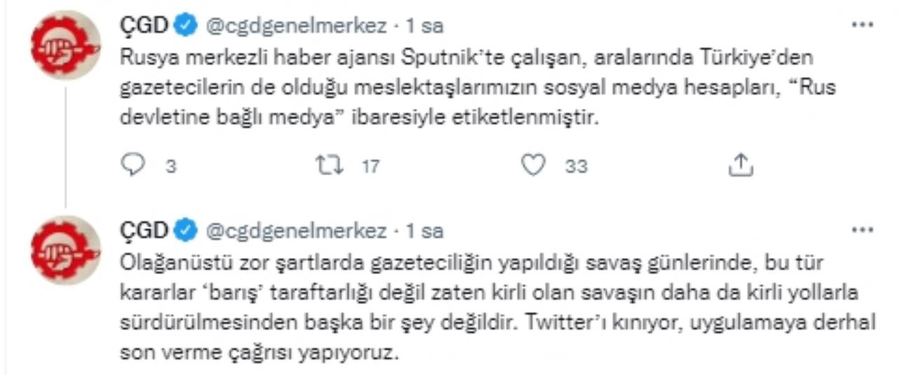 Çağdaş Gazeteciler Derneği'nden yapılan açıklamada da "Olağanüstü zor şartlarda gazeteciliğin yapıldığı savaş günlerinde, bu tür kararlar ‘barış’ taraftarlığı değil zaten kirli olan savaşın daha da kirli yollarla sürdürülmesinden başka bir şey değildir. Twitter’ı kınıyor, uygulamaya derhal son verme çağrısı yapıyoruz" ifadeleri kullanıldı.