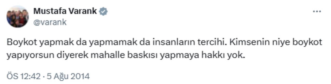 Bunlarla beraber, AKP milletvekili Mustafa Varank'ın 2014'te yaptığı paylaşım sosyal medyada gündem oldu. Varank söz konusu paylaşımda "Boykot yapmak da yapmamak da insanların tercihi. Kimsenin niye boykot yapıyorsun diyerek mahalle baskısı yapmaya hakkı yok" ifadelerini kullandı.