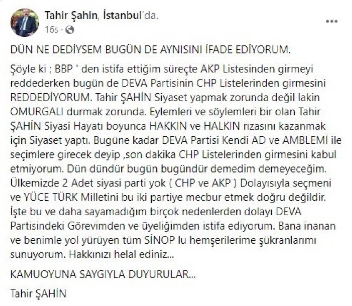 - Bugüne kadar DEVA Partisi kendi ad ve amblemi ile seçimlere girecek deyip, son dakika CHP listelerinden girmesini kabul etmiyorum. Ülkemizde 2 adet siyasi parti yok. Dolayısıyla seçmeni ve yüce Türk milletini bu iki partiye mecbur etmek doğru değildir. İşte bu ve daha sayamadığım birçok nedenlerden dolayı DEVA Partisi’ndeki görevimden ve üyeliğimden istifa ediyorum. Bana inanan ve benimle yol yürüyen tüm Sinoplu hemşerilerime şükranlarımı sunuyorum. Hakkınızı helal ediniz."