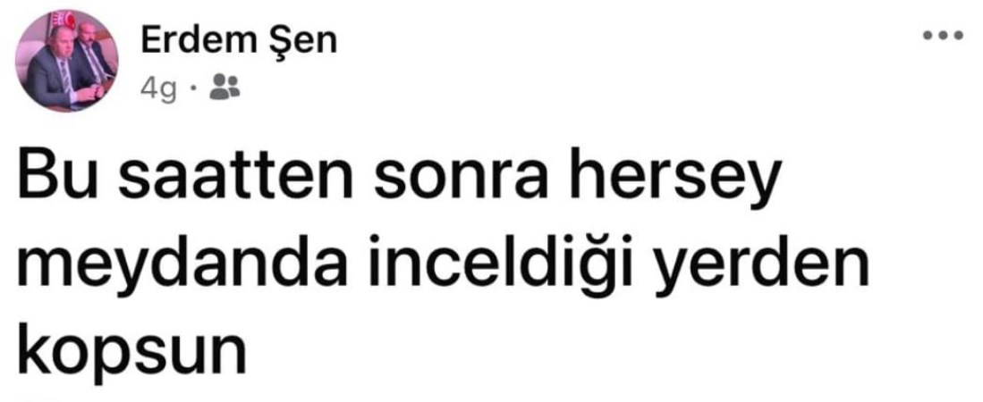 Erdem Şen, paylaşımlarında, 'Konuşmasını bilmez, başımıza bela olur demişsin. Ben konuşmasını bilirim, sadece yalan söyleyemem, senin gibi; orada haklısın. Bu saatten sonra her şey meydanda. İnceldiği yerden kopsun. Gerçi sen kendi öz yeğeninin hakkını yedin yıllarca. Bizimkinin lafı bile olmaz. Sorarlarsa tek tek anlatırız' yazdığı görüldü.