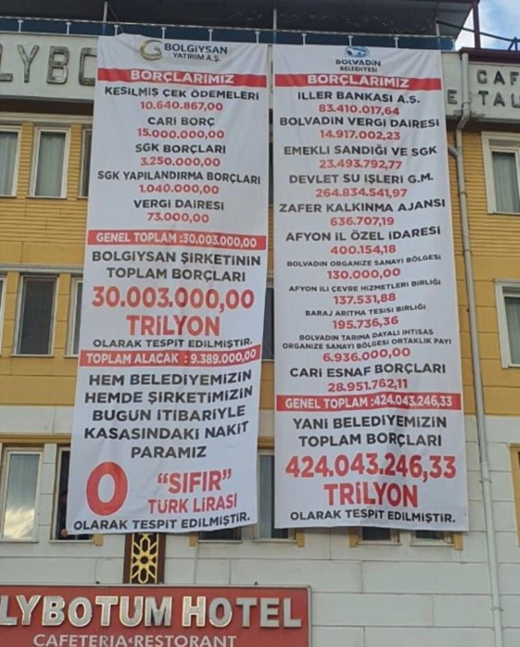 Derviş Aynacı, önceki dönem AKP’nin yönettiği belediyenin borçlarının yer aldığı pankartları belediye binasına astı. Belediye kasasında ‘sıfır’ lira kaldığı belirtilen pankartta 424 trilyonluk borcun varlığı ifade edildi.