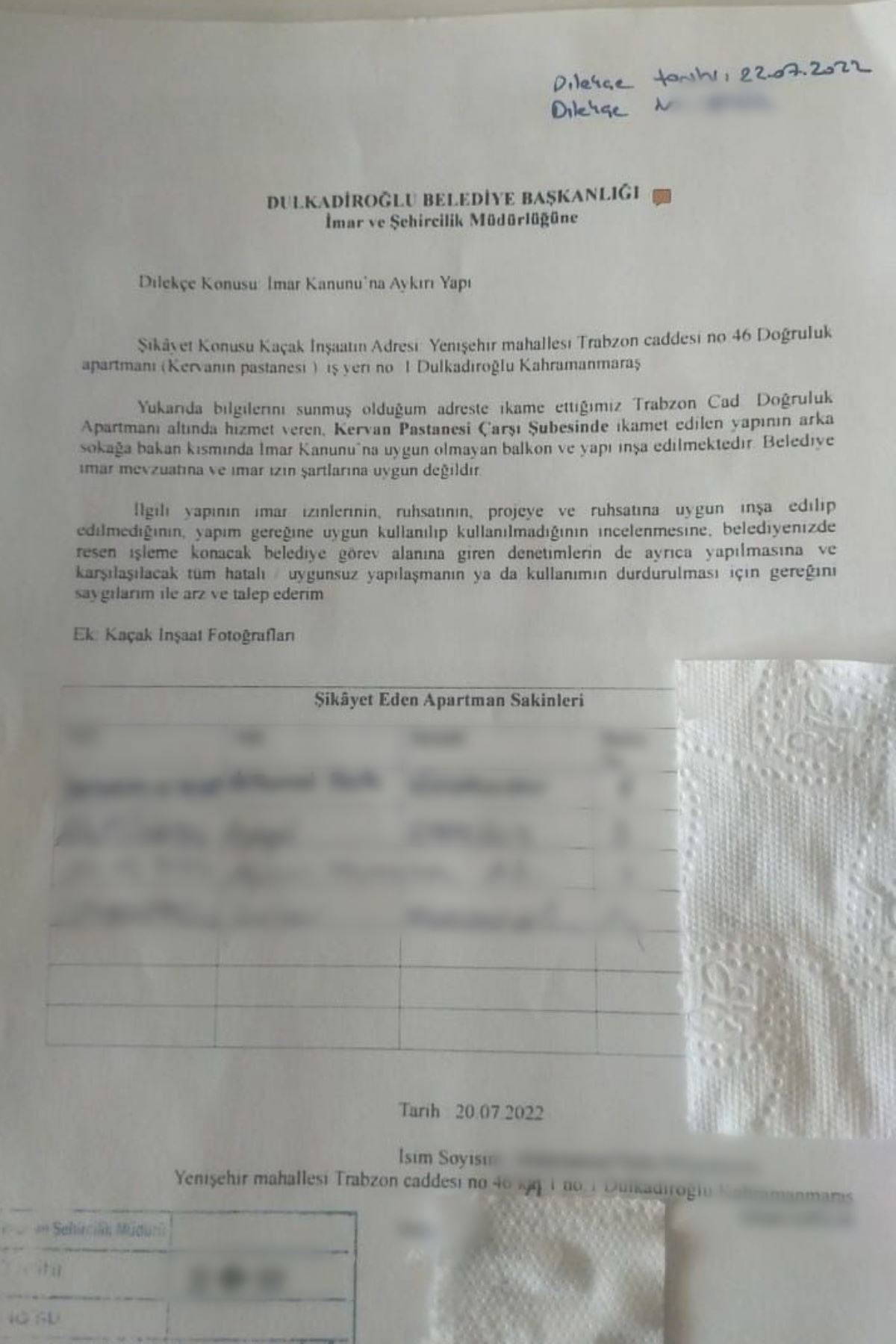 Bina sakinleri tarafından Kervan Pastanesi'nin binada yaptığı işlemlerin belediyeye şikayet edildiği belgede şu ifadeler geçti:
