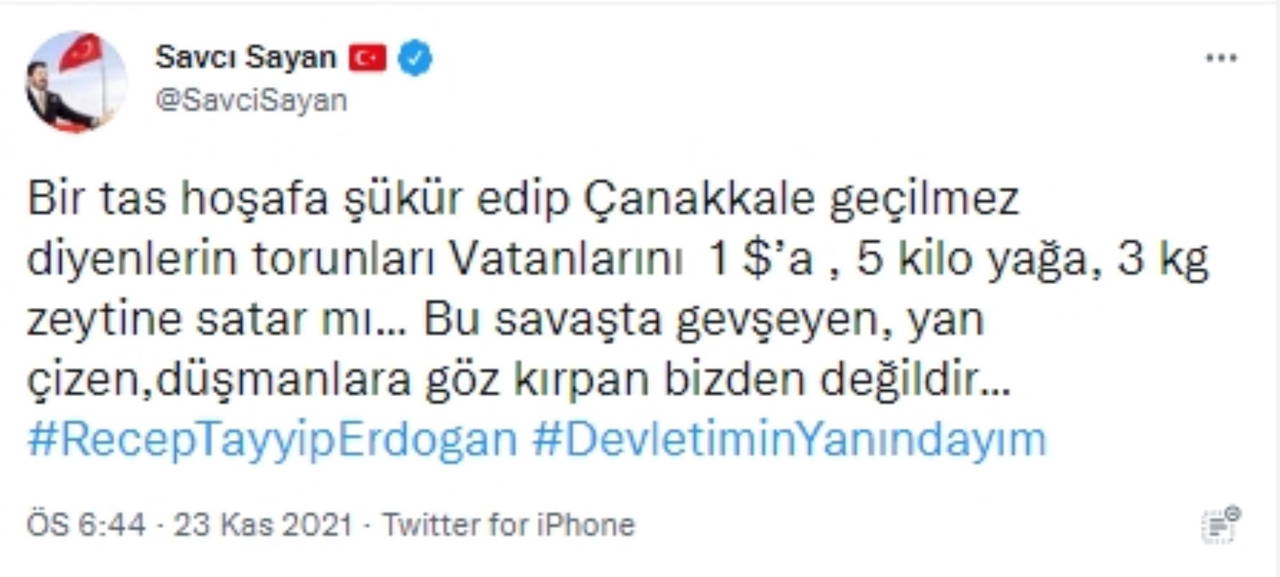 Sayan paylaşımında "Bir tas hoşafa şükür edip 'Çanakkale geçilmez' diyenlerin torunları Vatanlarını 1 $’a, 5 kilo yağa, 3 kg zeytine satar mı… Bu savaşta gevşeyen, yan çizen, düşmanlara göz kırpan bizden değildir… #RecepTayyipErdogan #DevletiminYanındayım" ifadelerini kullandı.