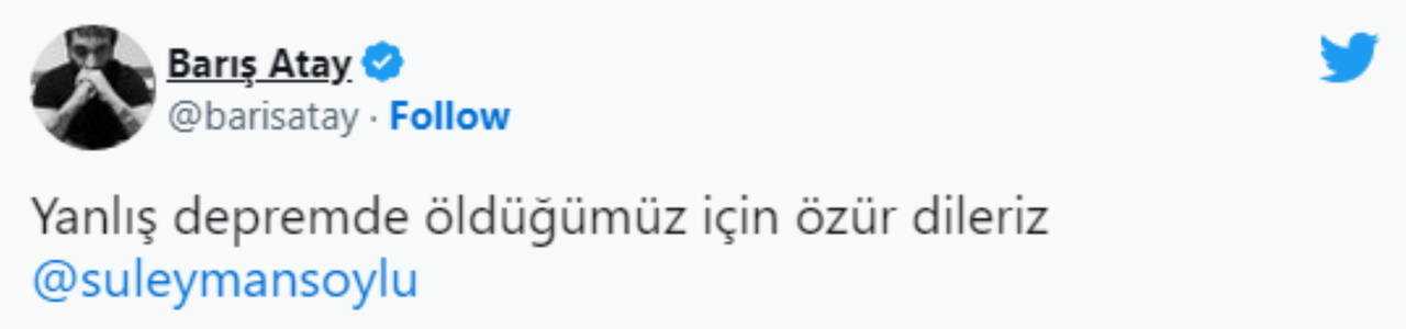 Türkiye İşçi Partisi (TİP) Hatay Milletvekili Barış Atay, Bakan Soylu'yu da etiketleyerek, "Yanlış depremde öldüğümüz için özür dileriz" diye yazdı.