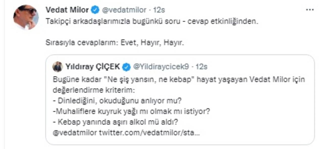 Ancak bu paylaşımı sonrası Milor Bahçeli'nin danışmanı ve Türkgün gazetesi yazarı Yıldıray Çiçek tarafından hedef alındı. Çiçek, "Bugüne kadar 'Ne şiş yansın, ne kebap' hayat yaşayan Vedat Milor için değerlendirme kriterim: - Dinlediğini, okuduğunu anlıyor mu? -Muhaliflere kuyruk yağı mı olmak mı istiyor? - Kebap yanında aşırı alkol mü aldı?" diye yazdı.
