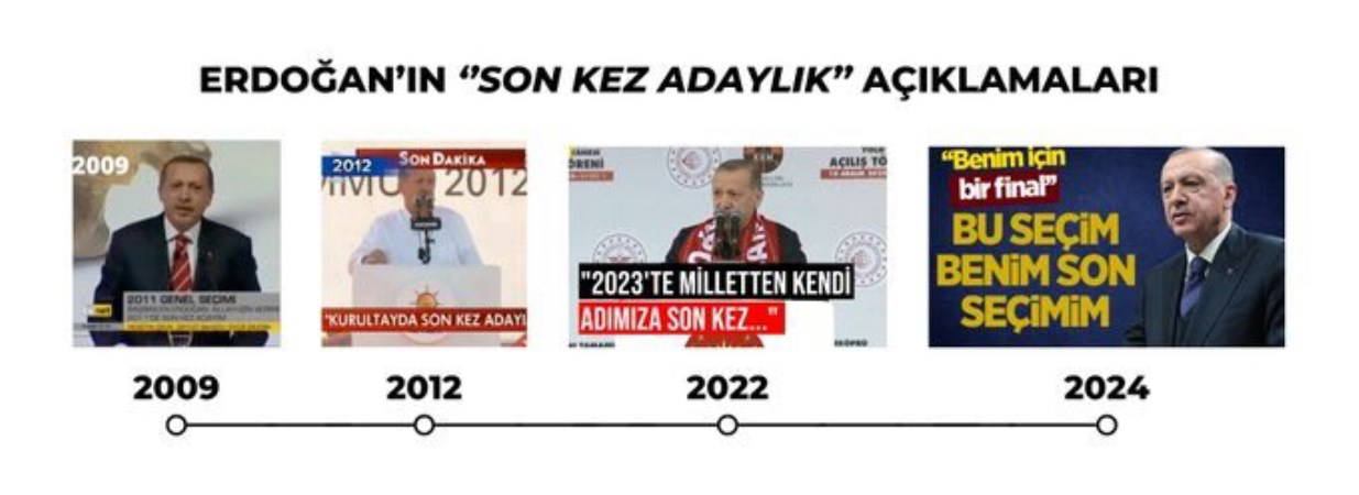 Erdoğan 2009 ve 2012'de milletvekili seçimlerini kastederek 'son kez' açıklaması yapmıştı. Erdoğan 2022'de ise 2023 Mayıs seçimini kastederek "2023’te milletten kendi adımıza son kez oy istiyoruz" demişti.