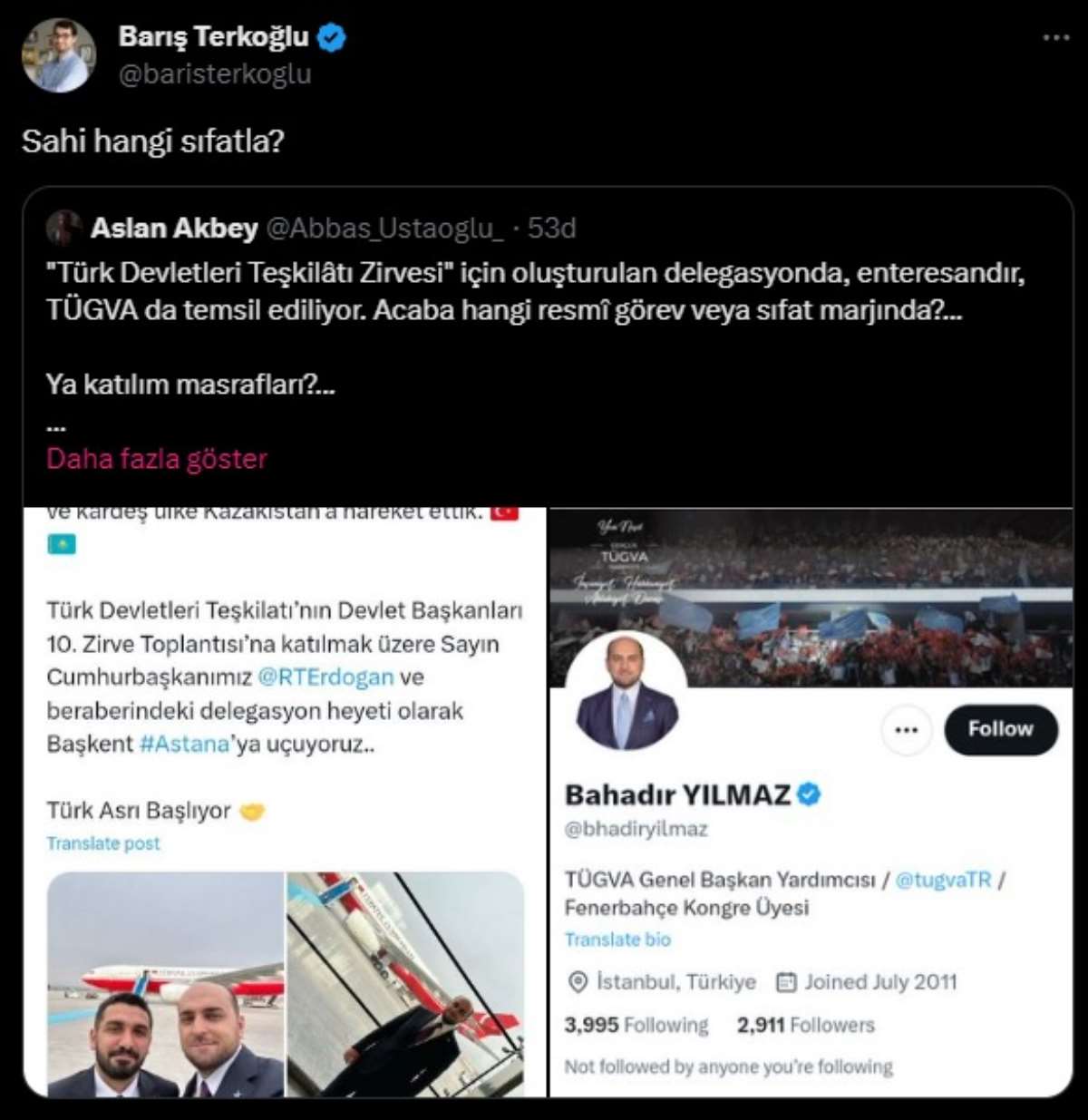 TÜGVA Genel Başkan Yardımcısı Bahadır Yılmaz, kişisel sosyal medya hesabından yaptığı paylaşımda "Sayın Cumhurbaşkanımızın riyasetinde, dost ve kardeş ülke Kazakistan’a hareket ettik. Türk Devletleri Teşkilatı’nın Devlet Başkanları 10. Zirve Toplantısı’na katılmak üzere Sayın Cumhurbaşkanımız ve beraberindeki delegasyon heyeti olarak Başkent #Astana’ya uçuyoruz.. Türk Asrı Başlıyor" ifadelerini kullandı.
