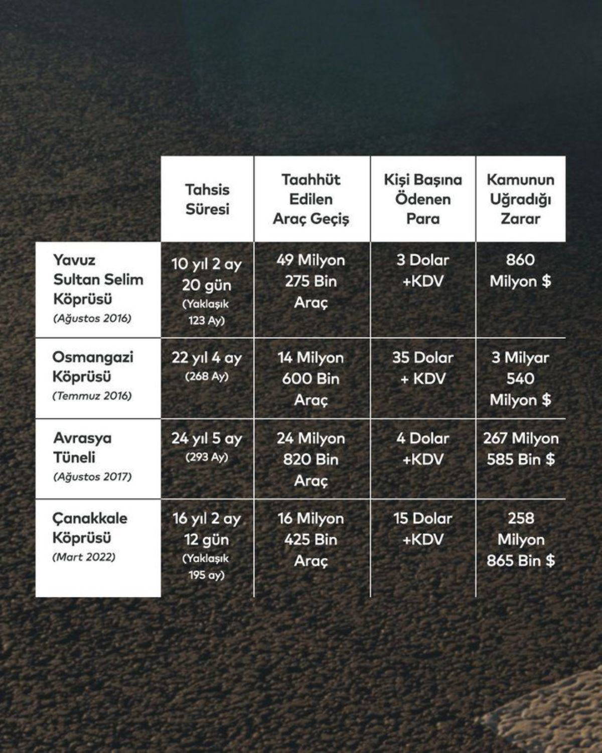 İstanbul Büyükşehir Belediyesi (İBB) Genel Sekreter Yardımcısı Buğra Gökce, ulaşımda kamu özel işbirliği (KÖİ) projeleriyle kamunun ne kadar zarara uğratıldığını açıkladı. Sosyal medya hesabından açıklama yapan Gökce, Yavuz Sultan Selim Köprüsü, Osmangazi Köprüsü, Avrasya Tüneli ve Çanakkale Köprüsü üzerinden kamunun uğradığı zararın yaklaşık 4.9 milyar dolar olduğunu açıkladı.
