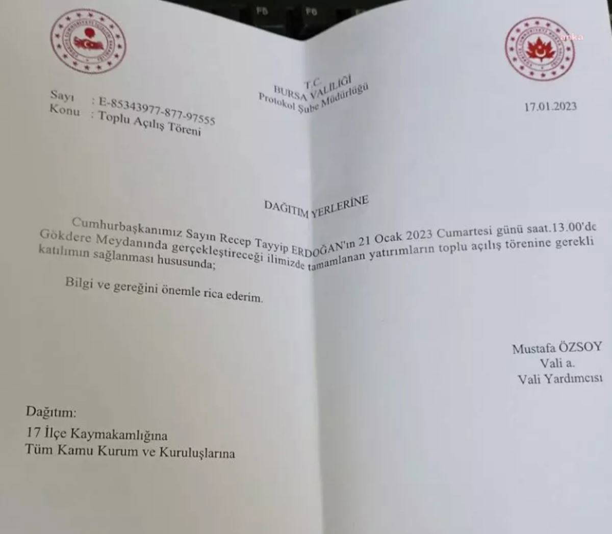 Yazıda "Cumhurbaşkanımız Sayın Recep Tayyip Erdoğan’ın 21 Ocak 2023 cumartesi günü saat 13:00’te Gökdere Meydanı’nda gerçekleştireceği, ilimizde tamamlanan yatırımların açılış törenine gerekli katılımın sağlanması hususunda bilgi ve gereğini önemle rica ederim" denildi.