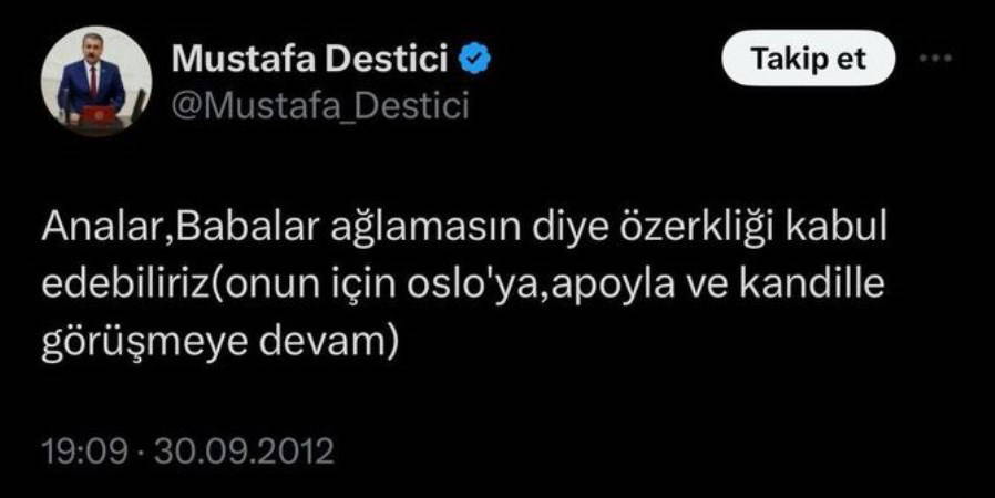 2012 yılında yaptığı o paylaşımda "Analar babalar ağlamasın diye özerkliği kabul edebiliriz (onun için Oslo'ya, Apo'yla ve Kandil'le görüşmeye devam)" ifadelerini kullandığı görülüyor.