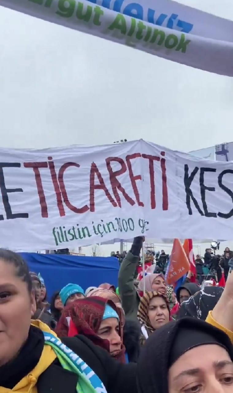 "Filistin için bin genç" isimli grup, Ankara'da düzenlenen mitingde Erdoğan konuştuğu sırada "İsrail ile ticareti kes" pankartı açtı.