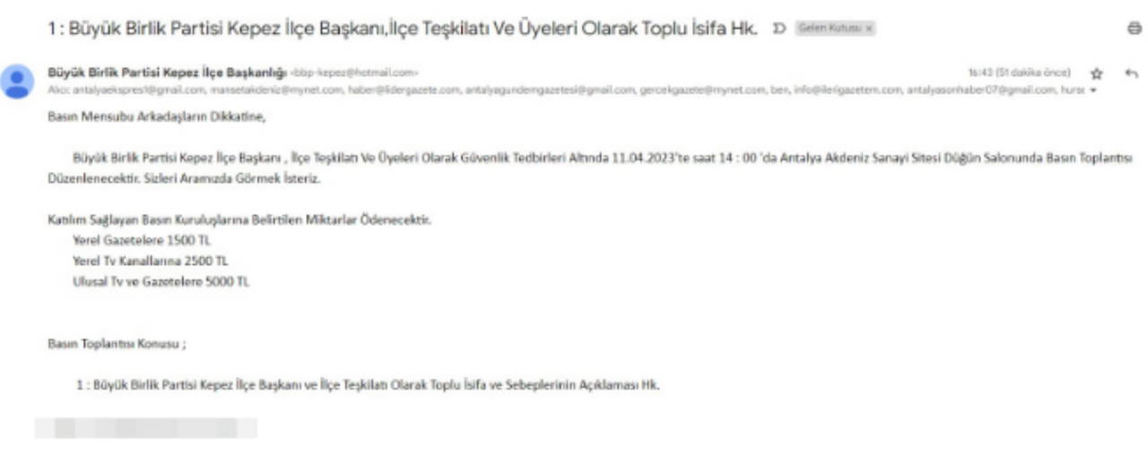 Büyük Birlik Partisi Kepez İlçe Teşkilatı, dün bölgedeki gazetelere bir basın daveti gönderdi. Teşkilatın gönderdiği davetiyede toplantıya katılacak basın yayın kuruluşlarına ödeme yapılacağı belirtildi. Çağdaş Gazeteciler Derneği Akdeniz Şubesi Yönetim Kurulu, yaptığı bir açıklama ile Büyük Birlik Partisi'ne tepki gösterdi.