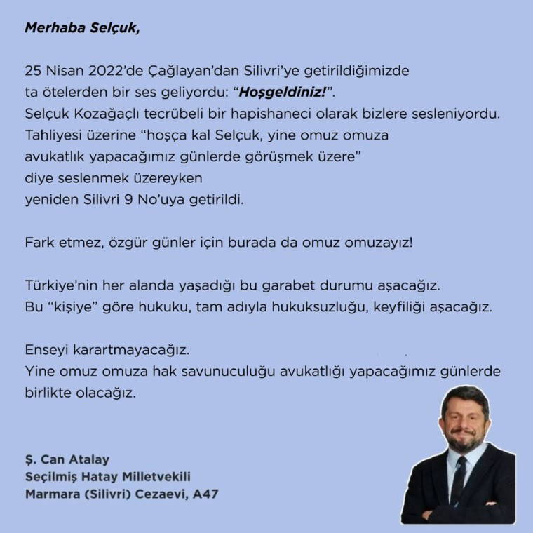 Anayasa Mahkemesi (AYM) kararlarına rağmen cezaevinde tutulan Türkiye İşçi Partisi (TİP) Hatay Milletvekili Can Atalay, yaklaşık 3 yıldır tutulduğu Silivri Cezaevi'nden, geçtiğimiz gün tahliye edilen ama bir gün sonra tekrar tutuklanan ÇHD Onursal Başkanı Selçuk Kozağaçlı'ya seslenen bir mektup yazdı.