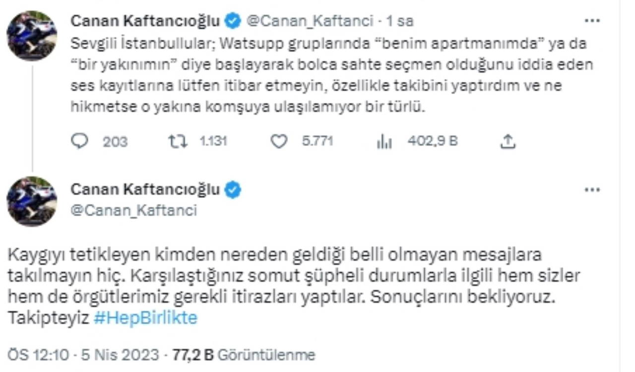 “Sevgili İstanbullular; WhatsApp gruplarında ‘Benim apartmanımda’ ya da ‘Bir yakınımın’ diye başlayarak bolca sahte seçmen olduğunu iddia eden ses kayıtlarına lütfen itibar etmeyin. Özellikle takibini yaptırdım ve ne hikmetse o yakına, komşuya ulaşılamıyor bir türlü.