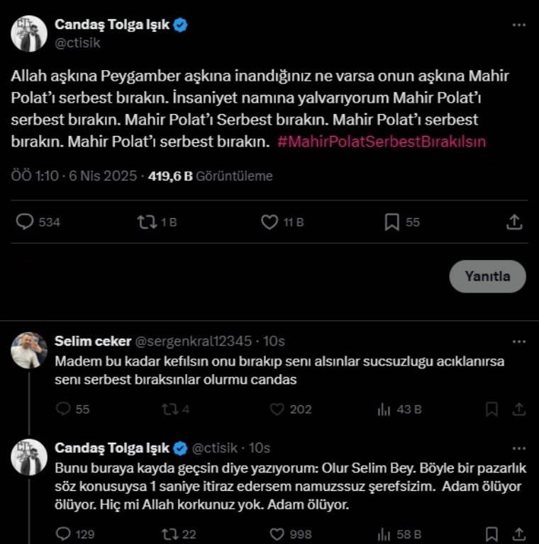 Mahir Polat’ın tahliye edilmesi için başatılan kampanyaya gazetci Candaş Tolga Işık da katıldı.