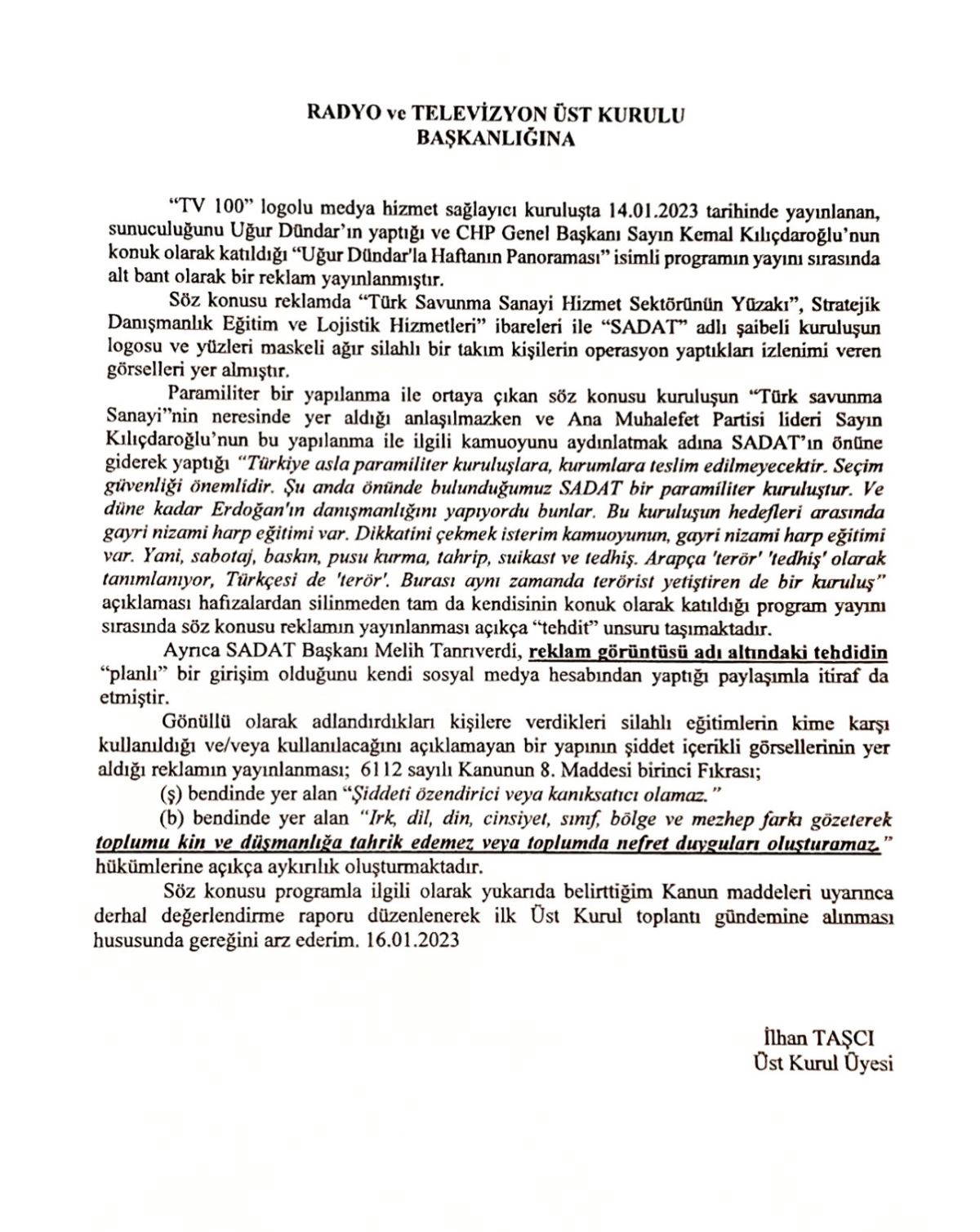 "TV 100 logolu medya hizmet sağlayıcı kuruluşta 14.01.2023 tarihinde yayınlanan, sunuculuğunu Uğur Dündar'ın yaptığı ve CHP Genel Başkanı Kemal Kılıçdaroğlu'nun konuk olarak katıldığı "Uğur Dündar'la Haftanın Panoraması" isimli programı yayını sırasında alt bant olarak bir rreklam yayınlanmıştır. Söz konusu reklamda "Türk Savunma Sanayi Hizmet Sektörünün Yüzakı", "Stratejik Sanışmanlık Eğitim ve Lojistik Hizmetleri" ibareleri ile SADAT adlı şaibeli kuruluşun logosu ve yüzleri maskeli ağır silahlı birtakım kişilerin operasyon yaptıkları izlenimi veren görselleri yer almıştır."