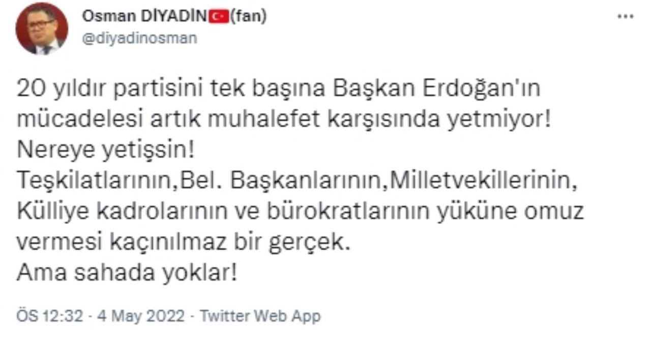 İddia, iktidara yakınlığıyla bilinen İnternethaber'de köşe yazarlığı yapan Osman Diyadin'den geldi. Diyadin, Twitter hesabından yaptığı paylaşımlarda AKP'li Cumhurbaşkanı Recep Tayyip Erdoğan'ın tek başına mücadelesinin artık muhalefet karşısında yetmediğine belirterek "Nereye yetişsin! Teşkilatlarının, Belediye başkanlarının, milletvekillerinin, Külliye kadrolarının ve bürokratlarının yüküne omuz vermesi kaçınılmaz bir gerçek. Ama sahada yoklar!" ifadelerini kullandı.