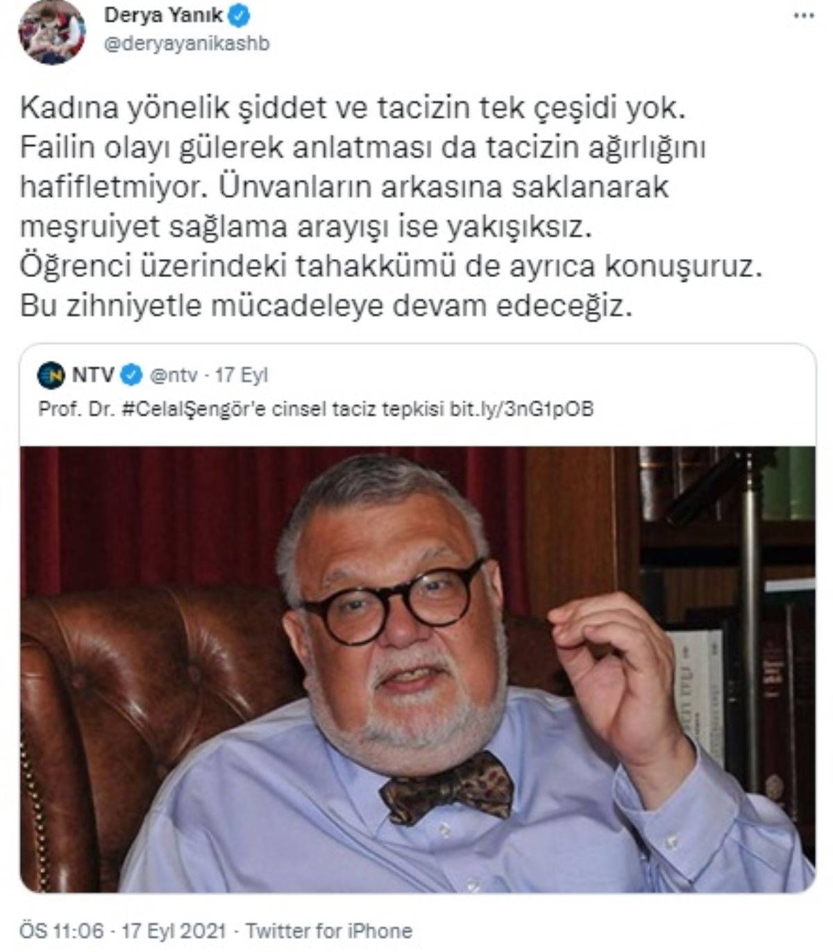 Prof. Dr. Celal Şengör'ün bir öğrencisiyle "anı"sını anlatırken "Eteğini kaldırdım, kıçına bir tokat attım" diyerek taciz ettiği dile getirmesi büyük tepki çekmişti. Prof. Dr. Celal Şengör’e bir tepki de Aile ve Sosyal Hizmetler Bakanı Derya Yanık'tan geldi.