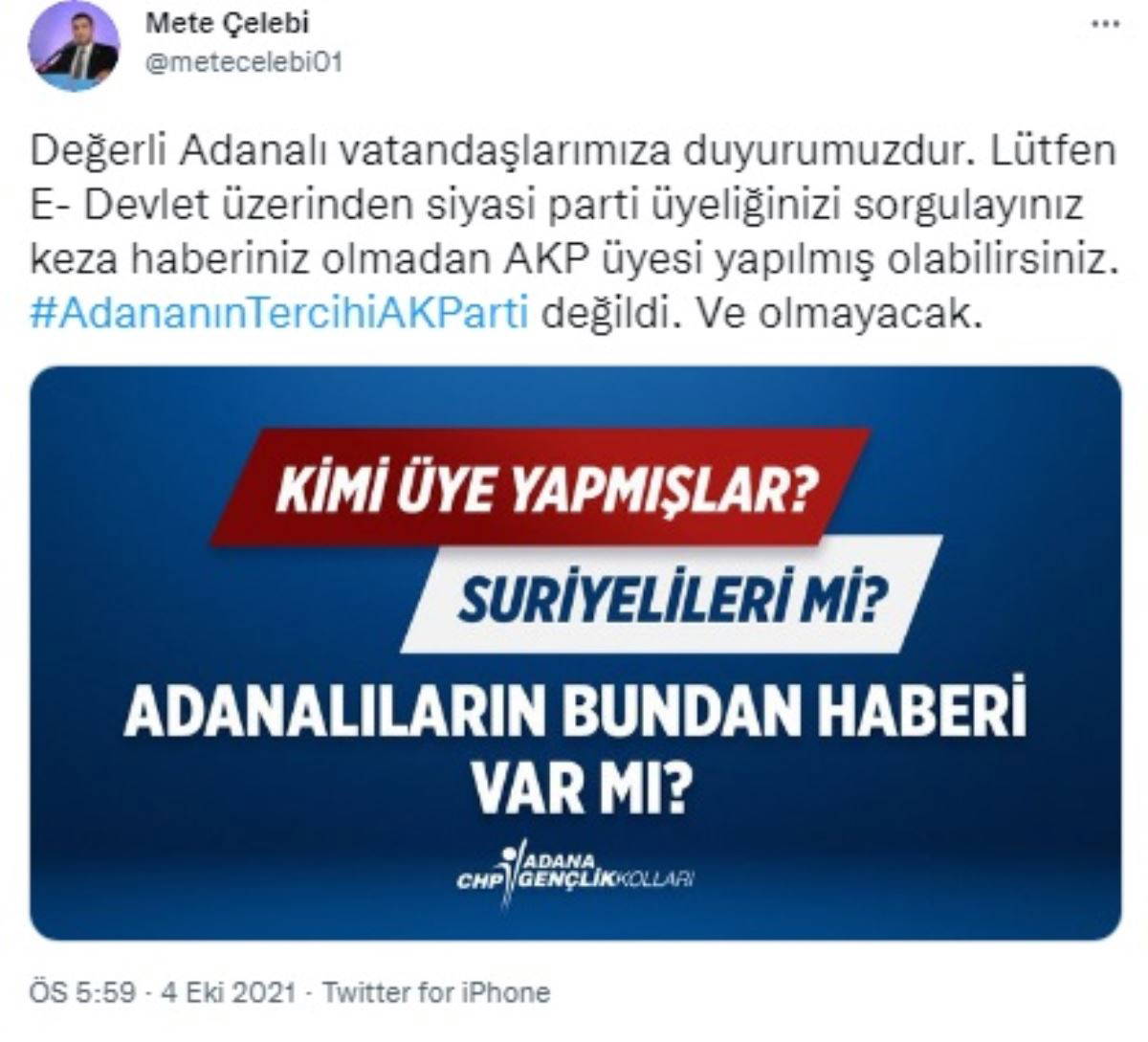 Mete Çelebi, “Kimi Üye Yapmışlar? Suriyelileri mi? Adanalıların Bundan Haberi Var mı?” paylaşımı ile Adanalılara seslenerek şu ifadeleri kullandı: